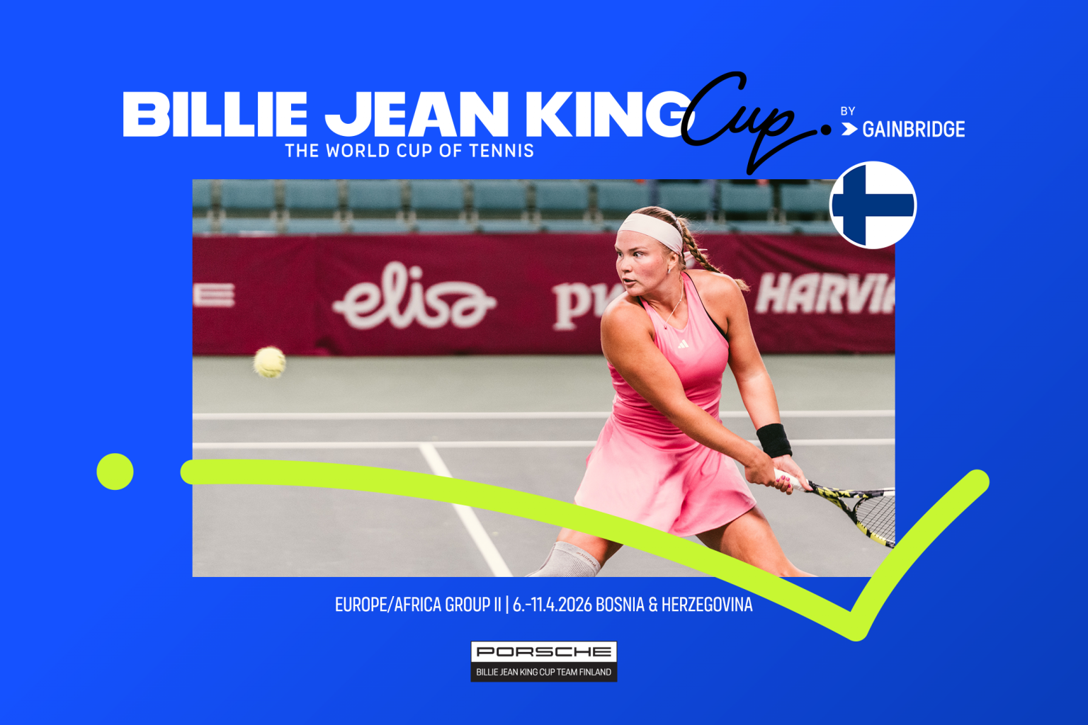 Suomen naisten maajoukkue, Porsche Billie Jean King Cup Team Finland, aloittaa urakkansa Billie Jean King Cup Eurooppa/Afrikka II-ryhmän turnauksessa maanantaina 6.4. Bosnia ja Hertsegovinassa, Banja Lukassa.