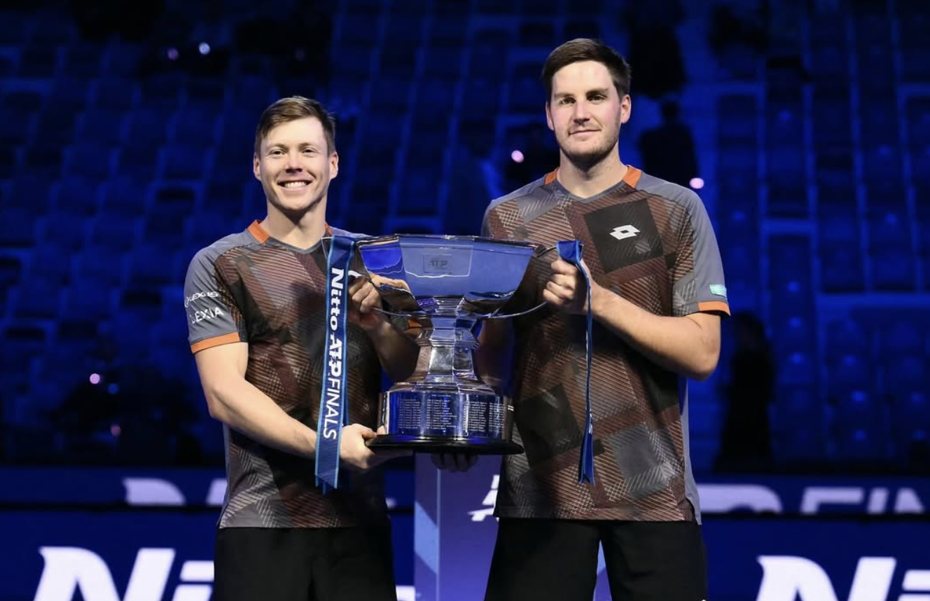Harri Heliövaara ja Henry Patten juhlivat kauden päätösturnauksen ATP Finals -kilpailun voittoa Torinossa. Loppuottelussa sunnuntaina kaatui Joe Salisbury/Neal Skupski erin 7-5, 6-3.