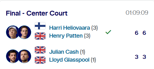 [3] Harri Heliövaara/ Henry Patten – [1] Julian Cash/Lloyd Glasspool 6-3, 6-3