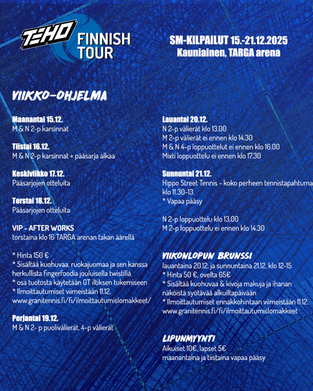 Päivittäinen otteluohjelma julkaistaan aina edeltävänä päivänä. Viikonlopun osalta ottelut käynnistyvät klo 13.00. Mikäli paikan päälle ei pääse niin kisapäiviä voi seurata myös läpi viikon Tennisliiton YouTube-kanavan välityksellä.